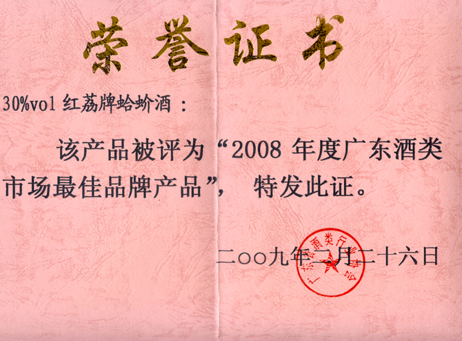 2008年-蛤蚧酒评为广东酒类市场最佳品牌产品
