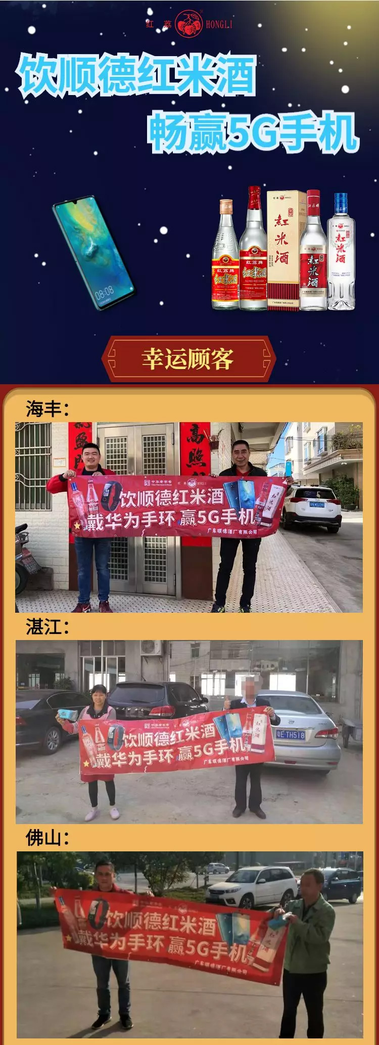 活动期间,凡购买(2018年8月31日后生产的以下产品)500ml公海赌赌船710检测路线牌公海赌赌船710检测路线红米酒,500ml金装公海赌赌船710检测路线红米酒,尚品公海赌赌船710检测路线红米酒,用微信扫一扫瓶盖二维码,即有机会获得华为5G手机。饮公海赌赌船710检测路线红米酒,助你领跑全世界。