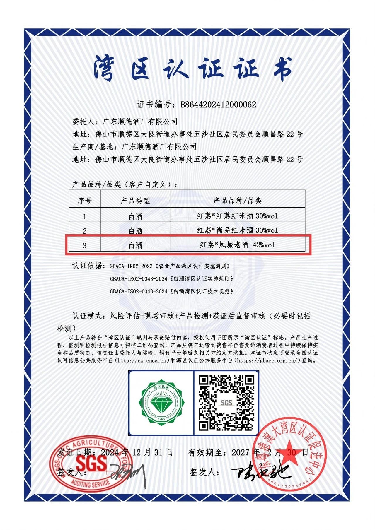 “湾区认证”是在国家市场监管总局和粤港澳三地政府有关部门指导下,由三地认证机构等经营主体,在工业消费品、农食产品和服务业等领域,基于粤港澳大湾区共通执行标准,以粤港澳认证联盟形式开展的高端品质认证活动,为消费者提供了权威品质保障,为品质盖上“信任钢印”。湾区认证标准来自大湾区,通过湾区认证的产品,可以直供港澳!凤城老酒凭借严格的原料筛选、质量把控以及优质的产品体验,成为首个获得湾区认证的白酒类产品。其产品不仅符合大湾区互联互通的品质要求,更成为推广“粤菜配粤酒”饮食文化的重要载体。