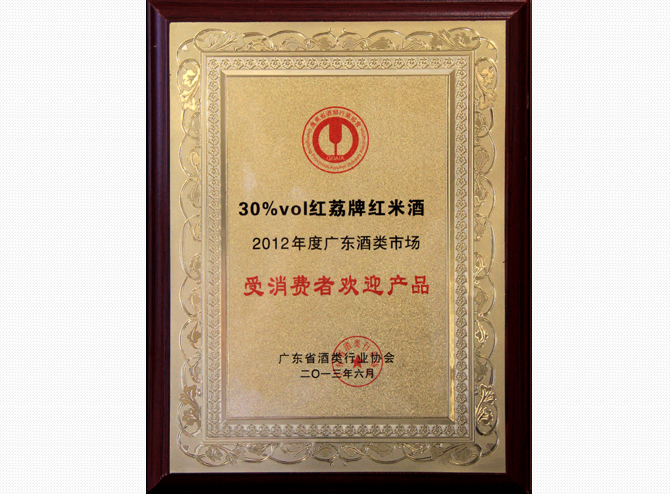 2012年-红米酒评为广东酒类市场受消费者欢迎产品