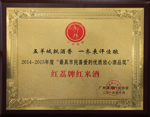 2014-2015年—公海赌赌船710检测路线牌红米酒获最具市民喜爱的优质放心酒品奖