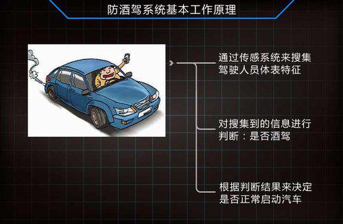 纵观上述汽车生产企业研发的防酒驾系统,其基本原理大致相同,均是通过传感系统来判断驾驶者血液中酒精含量是否超标,据此反馈给汽车电脑系统,从而决定是否正常启动汽车。